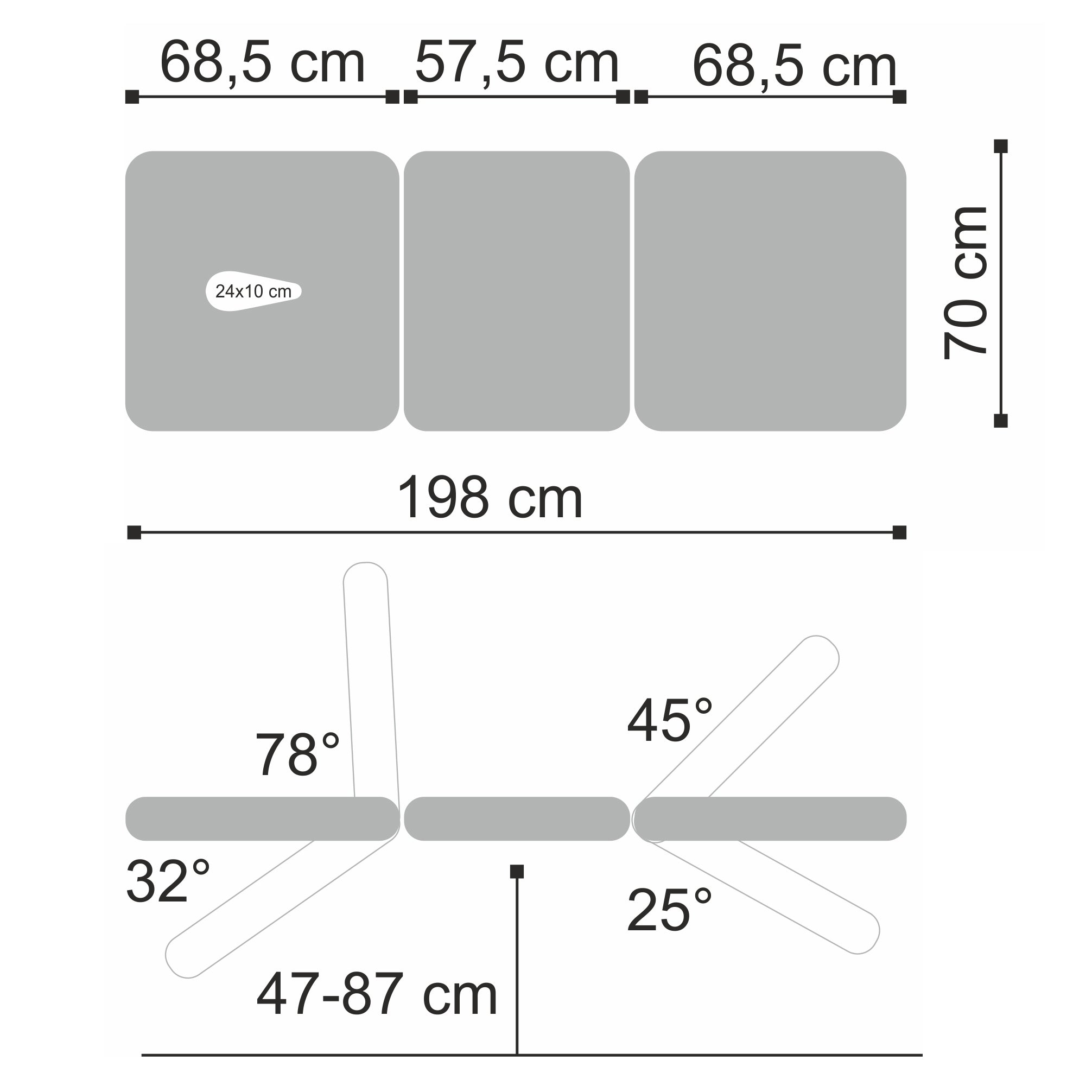 Three-section top: designed for universal application, the top measures 198 x 70 cm, with adjustment of the leg and headrest sections, allowing the patient's position to be adapted to various therapeutic procedures.